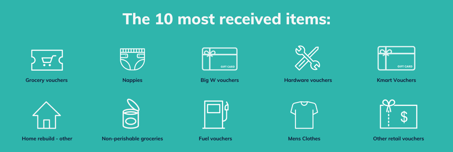 You can see below the essential items and services that are still needed by people affected by these natural disasters. Consider donating money by clicking on the FUND button next to a request. You can also choose to donate funds here. 100% of publicly donated money received by GIVIT will be used to buy exactly what's needed by people experiencing hardship. GIVIT also endeavours to buy items locally wherever possible to stimulate the economic recovery of local communities.